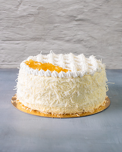 Massa: pão de ló branco. Recheio: creme de coco com doce de abacaxi em pedaços. Cobertura: chantilly coberto com chocolate branco, coco em flocos e geleia de abacaxi em pedaços. 1kg