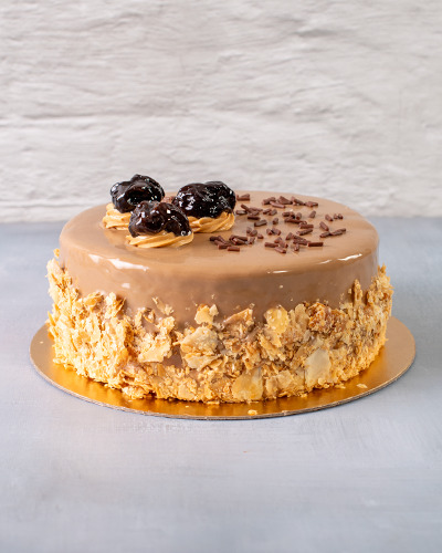 Massa: pão de ló branco. Recheio: doce de leite com ameixas picadas. Cobertura: chantilly coberto com chocolate de caramelo, massa folhada e ameixa. 1kg