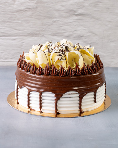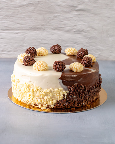 Massa: pão de ló branco e pão de ló de chocolate. Recheio: brigadeiro ao leite e brigadeiro branco. Cobertura: chantilly coberto com chocolate branco e ao leite, pastilhas de chocolate brnaod e ao leite e brigadeiros.1kg