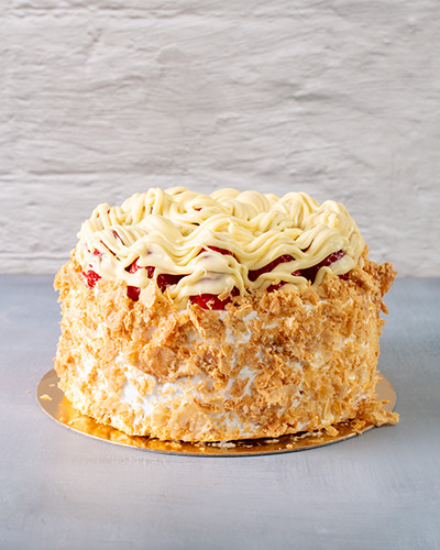 Massa: pão de ló branco e massa folhada. Recheio: chantilly, trufa de chocolate branco e morangos picados. Cobertura: chantilly, massa folhada, trufa de chocolate branco e morangos. 1kg