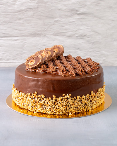 Massa: pão de ló de chocolate. Recheio: creme de ganache com avelã. Cobertura: chantilly de chocolate coberto com chocolate meio amargo, castanha xerém, bombom Ferrero Rocher e ganache. 1kg