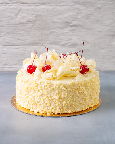 Massa: pão de ló branco. Recheio: chantilly, cereja e chocolate ao leite picado. Cobertura: chantilly, raspas de chocolate branco, cereja e pastilha de chocolate. 1kg