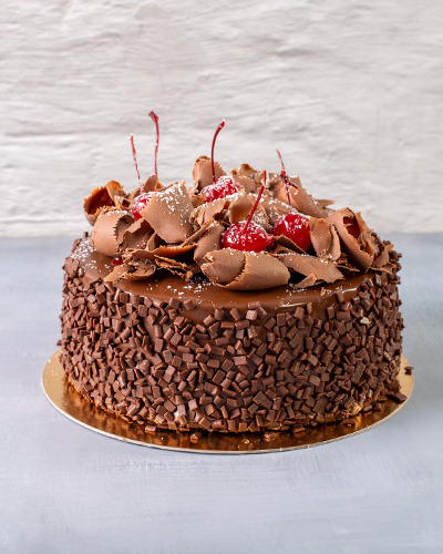 Massa: pão de ló de chocolate. Recheio: chantilly, cereja e chocolate ao leite picado. Cobertura: chantilly de chocolate, raspas de chocolate, cereja e pastilha de chocolate ao leite. 1kg