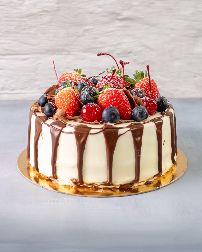 Massa: pão de ló branco. Recheio: trufa de frutas vermelhas. Cobertura: chantilly coberto com chocolate branco e ao leite e frutas vermelhas frescas. 1kg