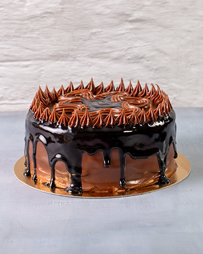Massa: pão de ló de chocolate. Recheio: ganache de chocolate meio amargo. Cobertura: chantilly de chocolate coberto com chocolate meio amargo, calda de chocolate e pitangas de ganache. 1kg