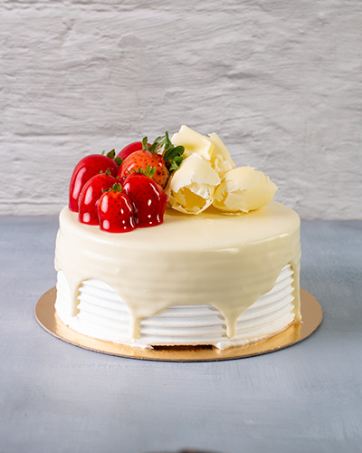 Massa: pão de ló branco. Recheio: trufa de chocolate branco e morangos picados. Cobertura: chantilly coberto com chocolate branco, raspas de chocolate e morangos. 1kg