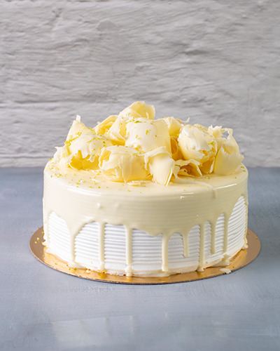 Massa: pão de ló branco. Recheio: creme de limão. Cobertura: chantilly coberto com chocolate branco e raspas de chocolate branco. 1kg