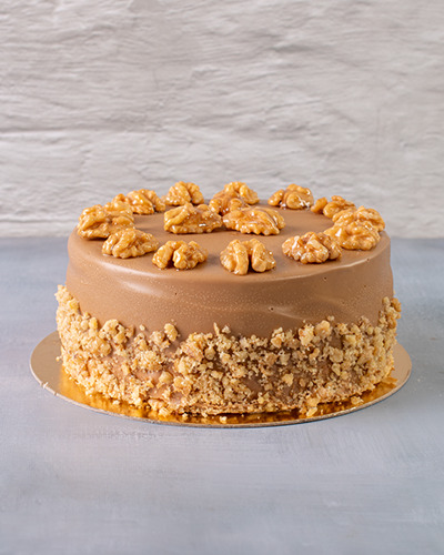 Massa: pão de ló branco. Recheio: creme de nozes. Cobertura: chantilly coberto com chocolate de caramelo e nozes. 1kg