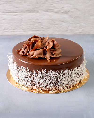 Massa: pão de ló de chocolate. Recheio: creme de coco. Cobertura: chantilly de chocolate coberto com chocolate meio amargo, raspas de chocolate ao leite e coco em flocos. 1kg